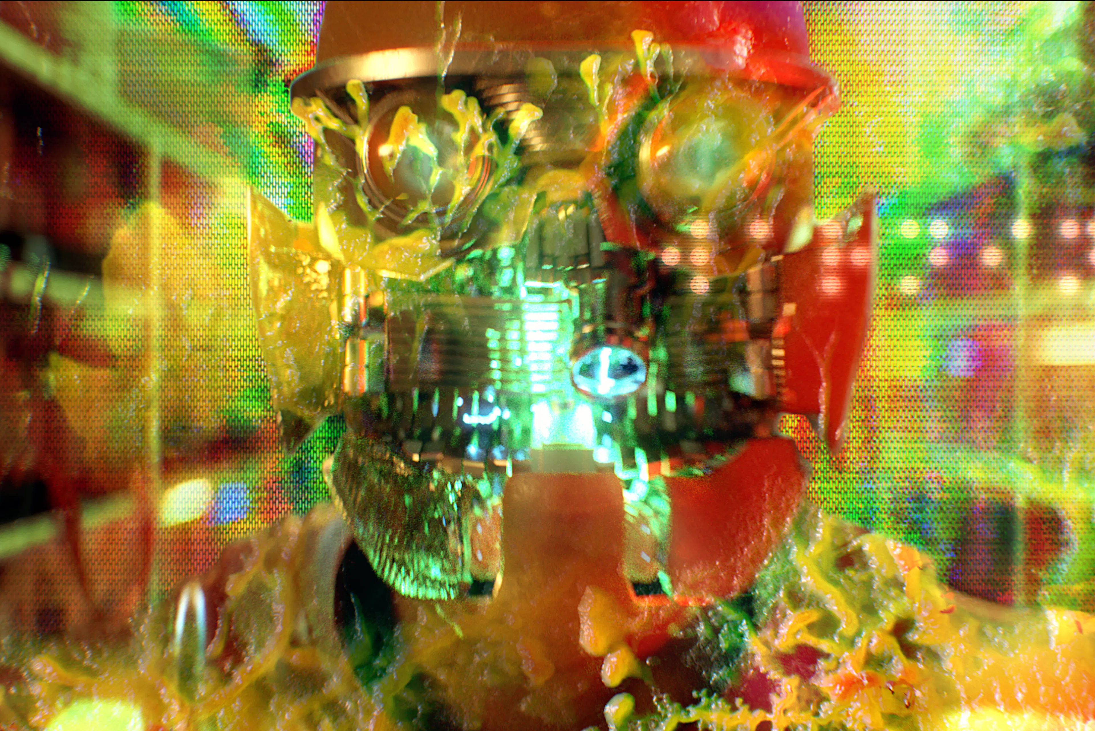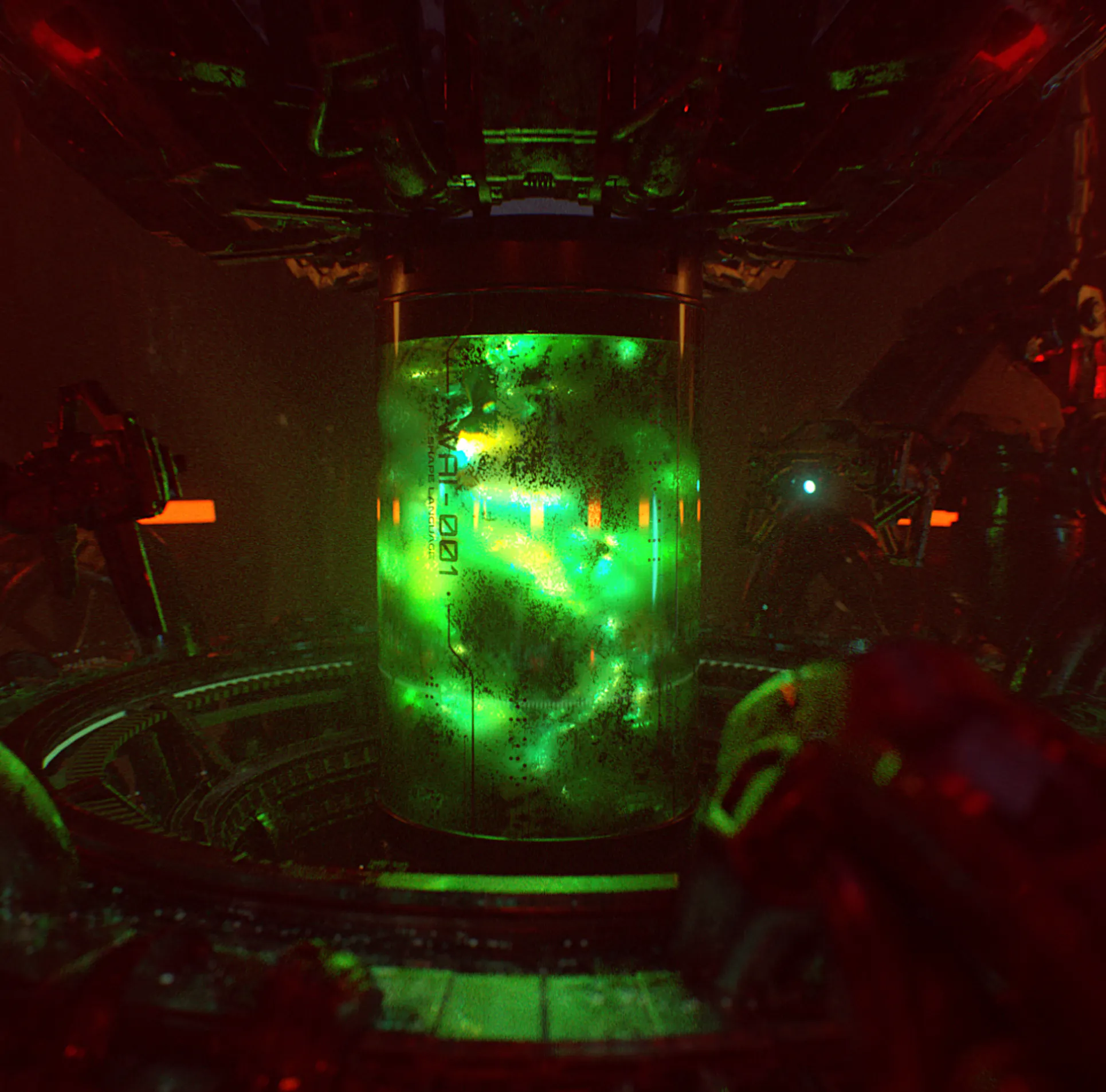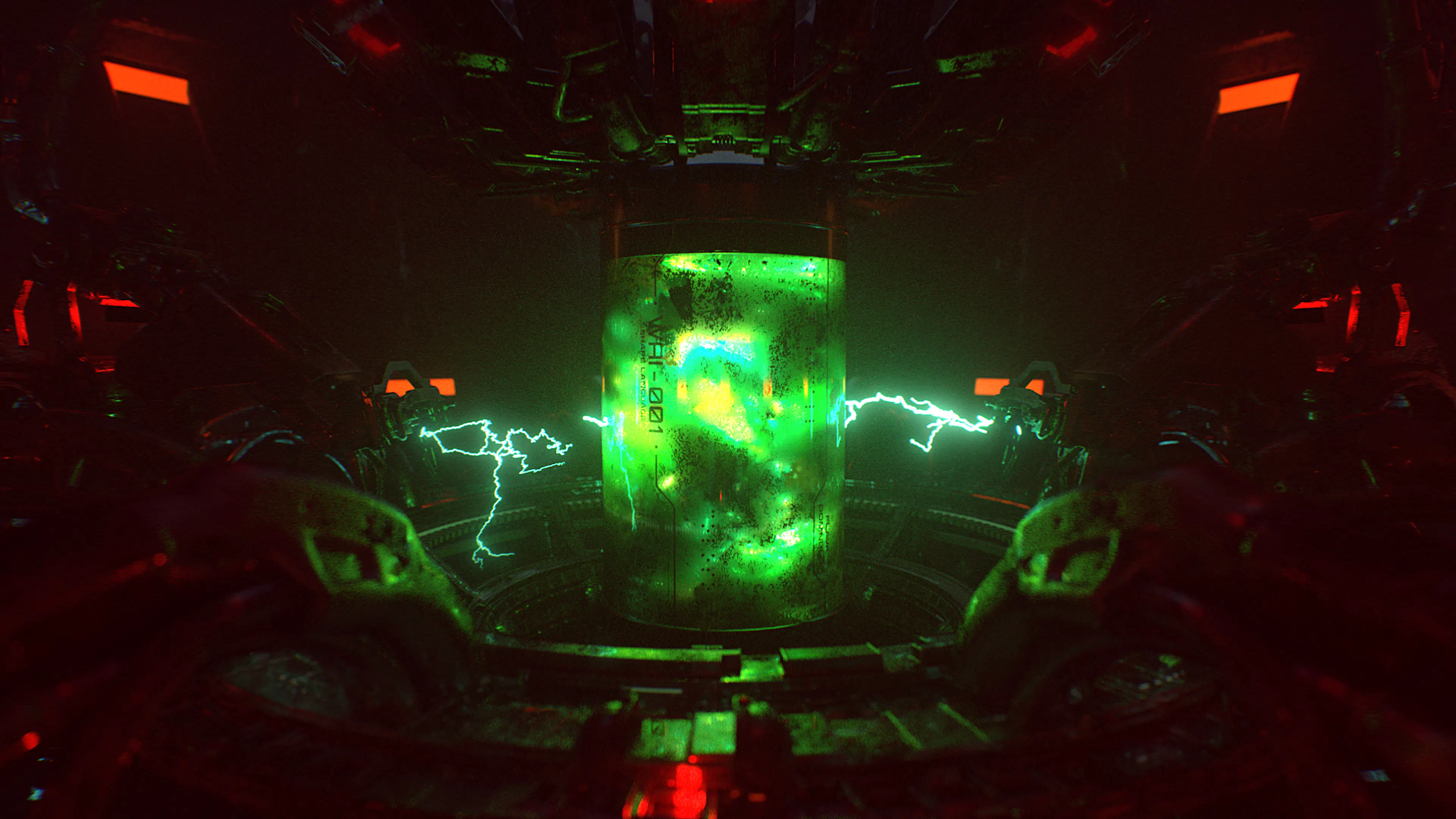 Dominated by toxic greens, sickly yellows, and deep industrial reds, contrasted with warm amber practical lights. The palette evokes chemical processes, radiation, and bio-engineering, reinforcing a sense of danger and instability.