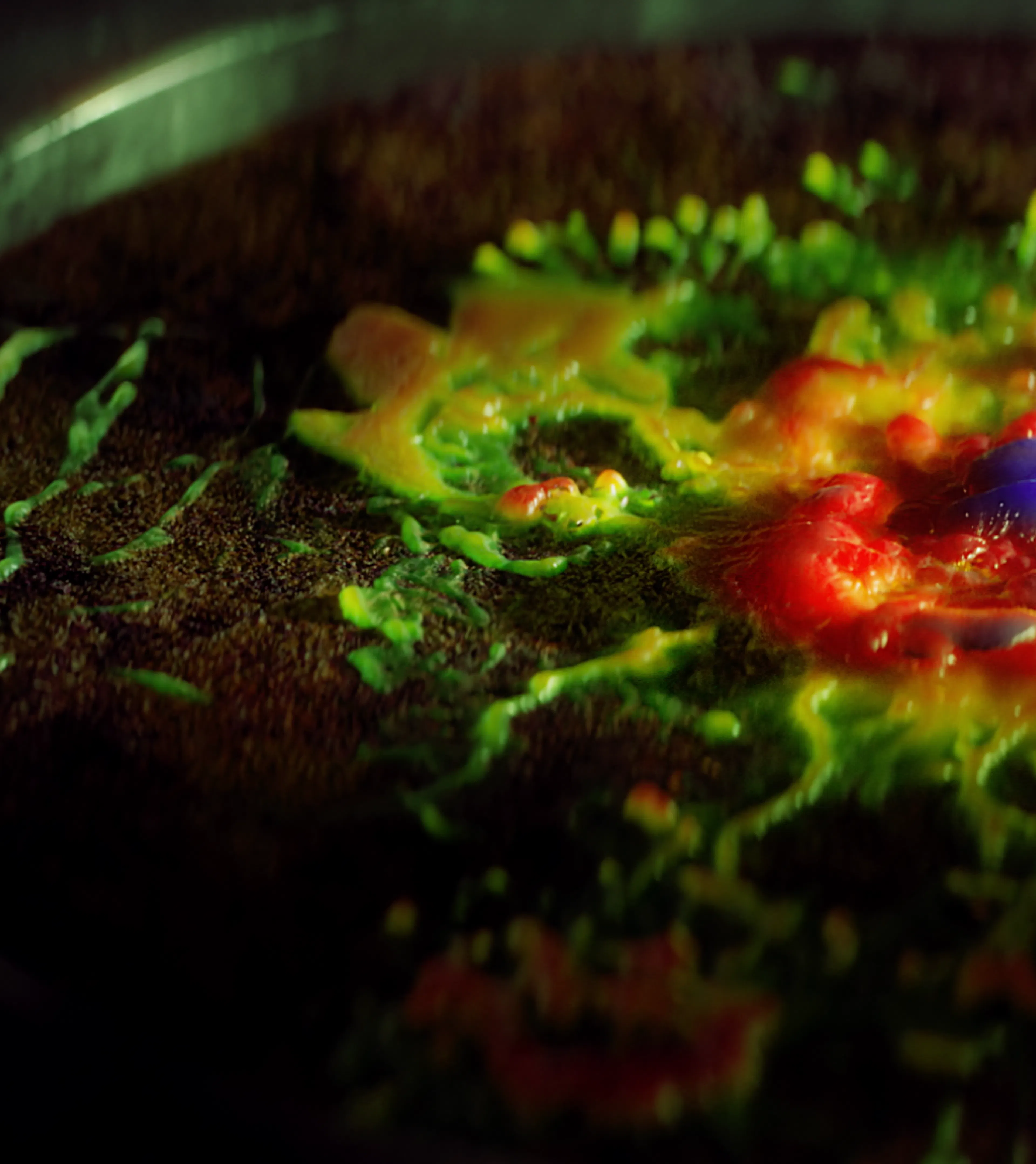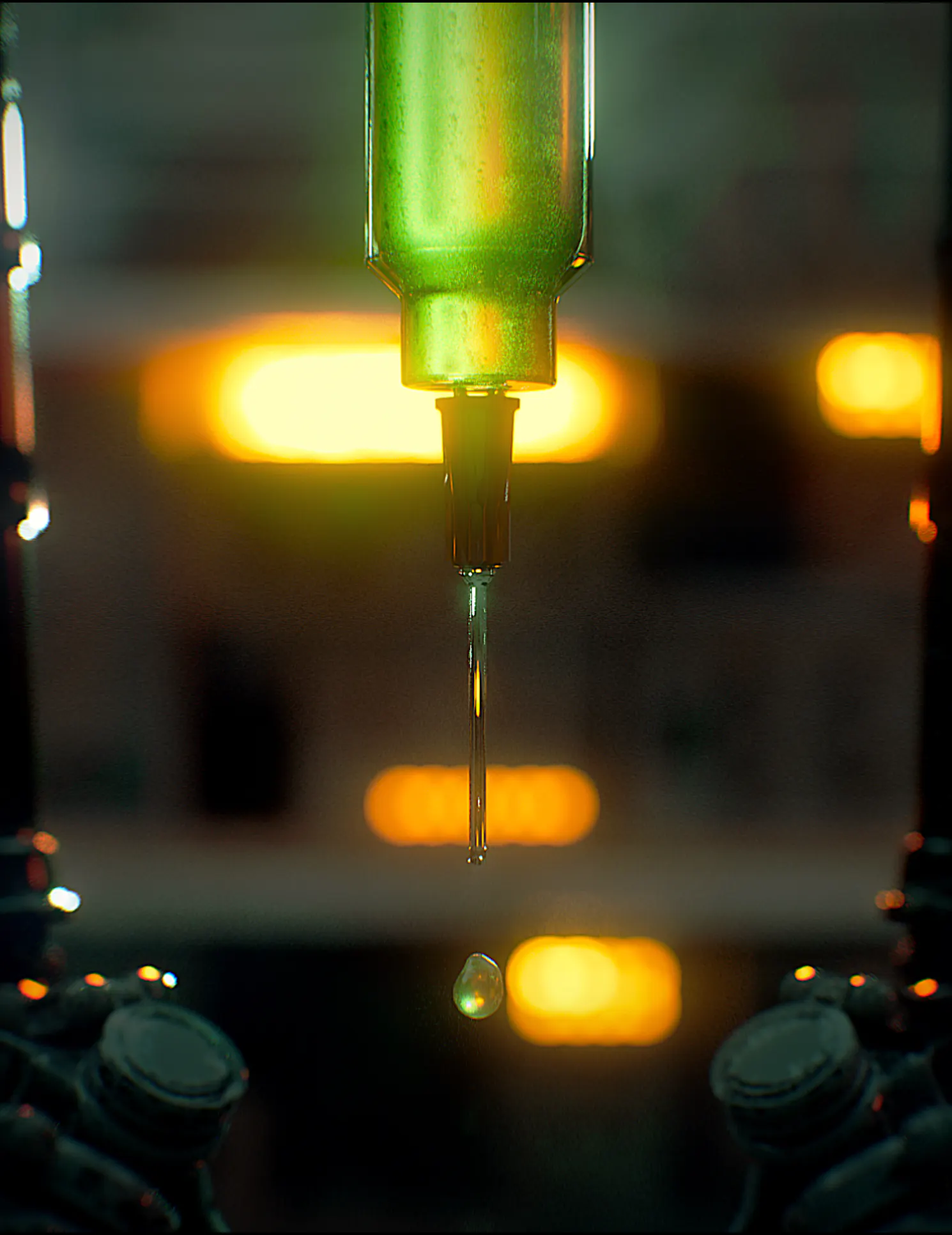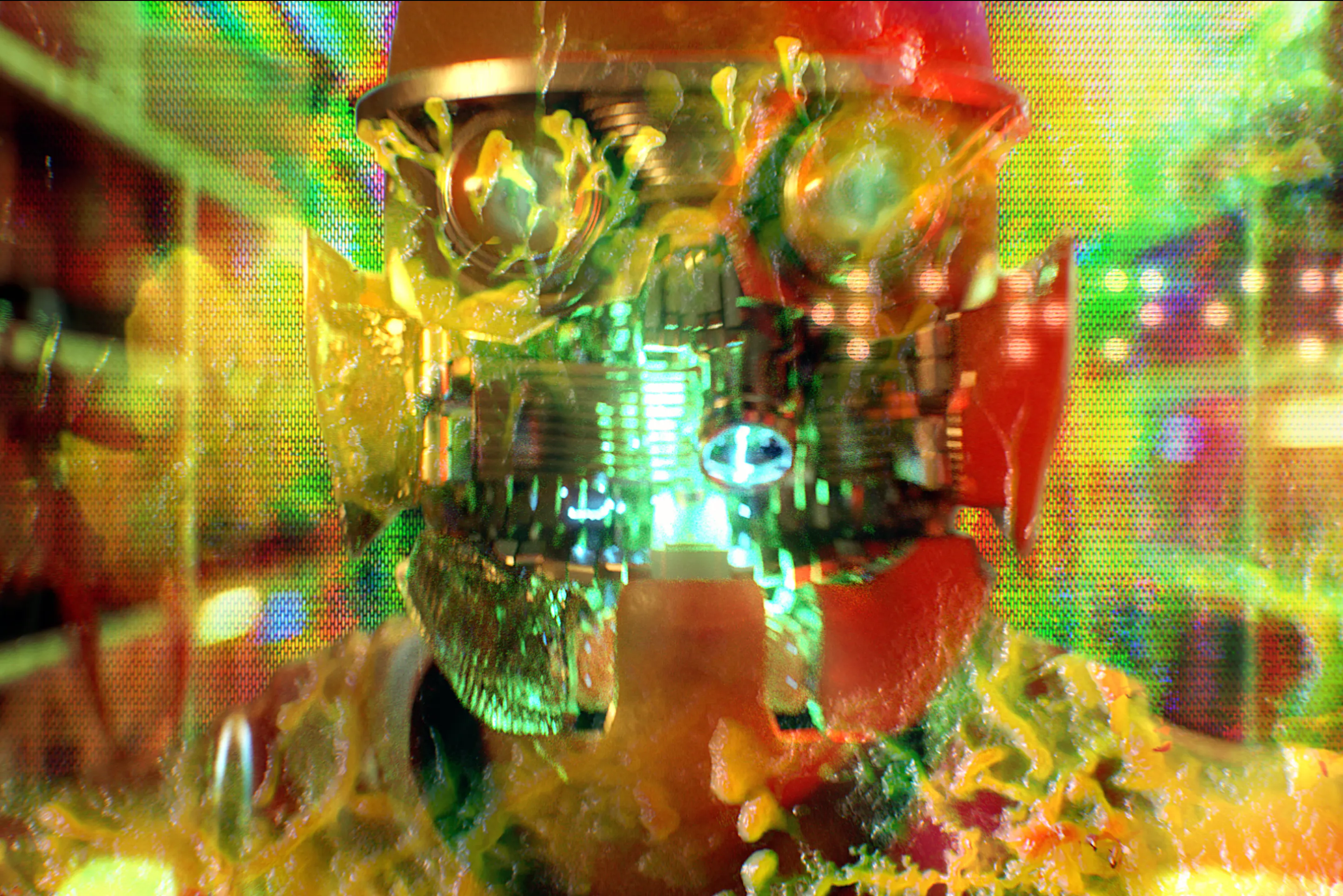 Dominated by toxic greens, sickly yellows, and deep industrial reds, contrasted with warm amber practical lights. The palette evokes chemical processes, radiation, and bio-engineering, reinforcing a sense of danger and instability.