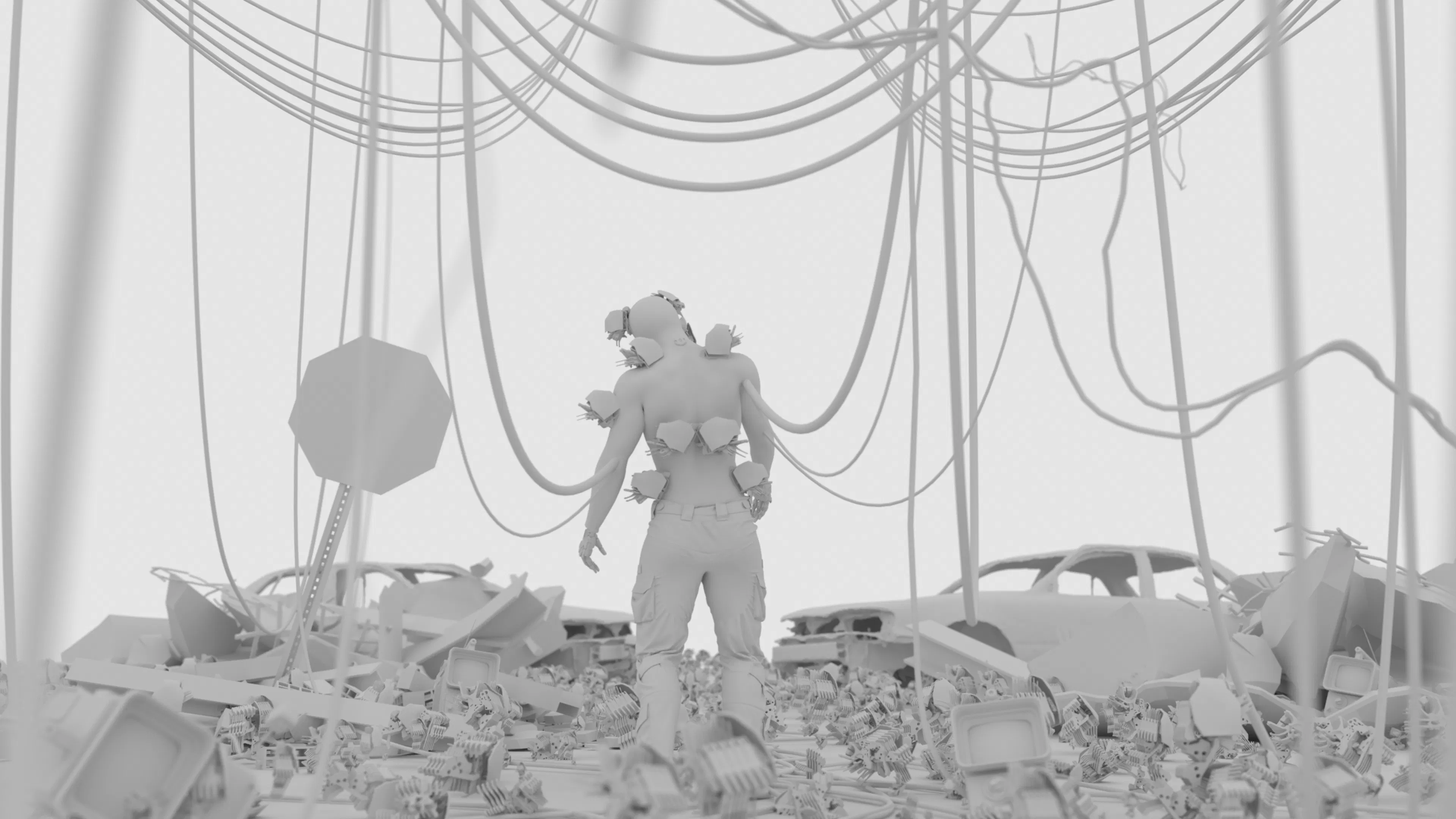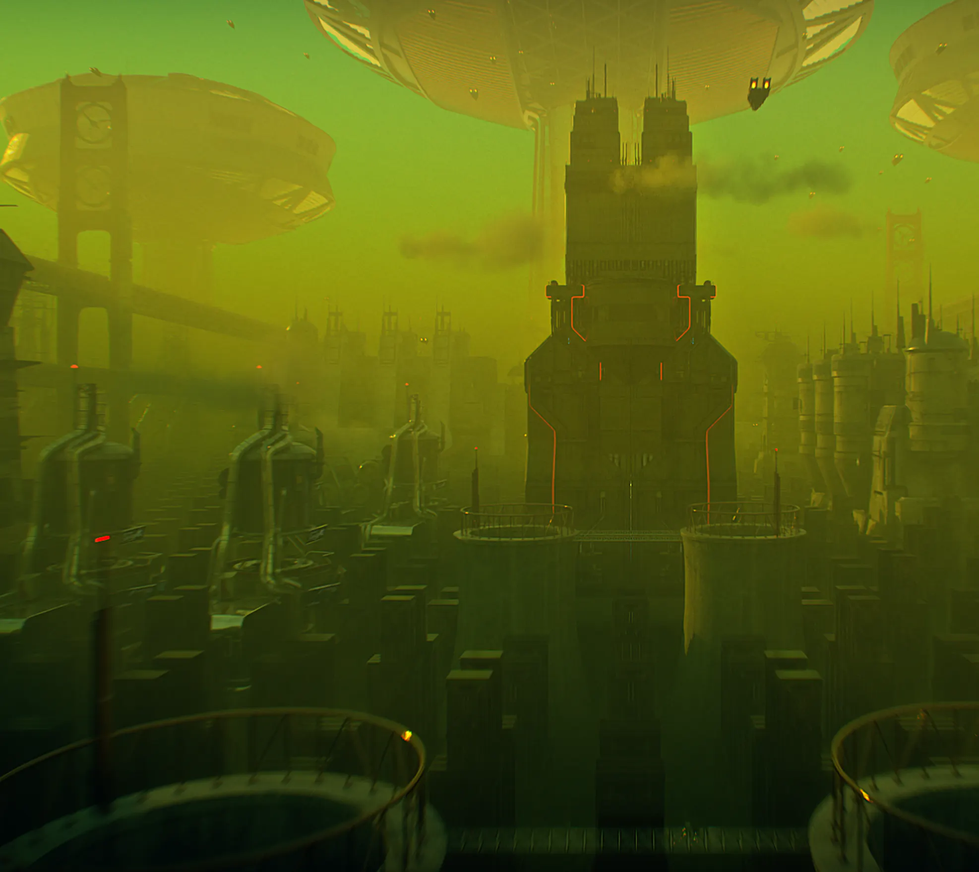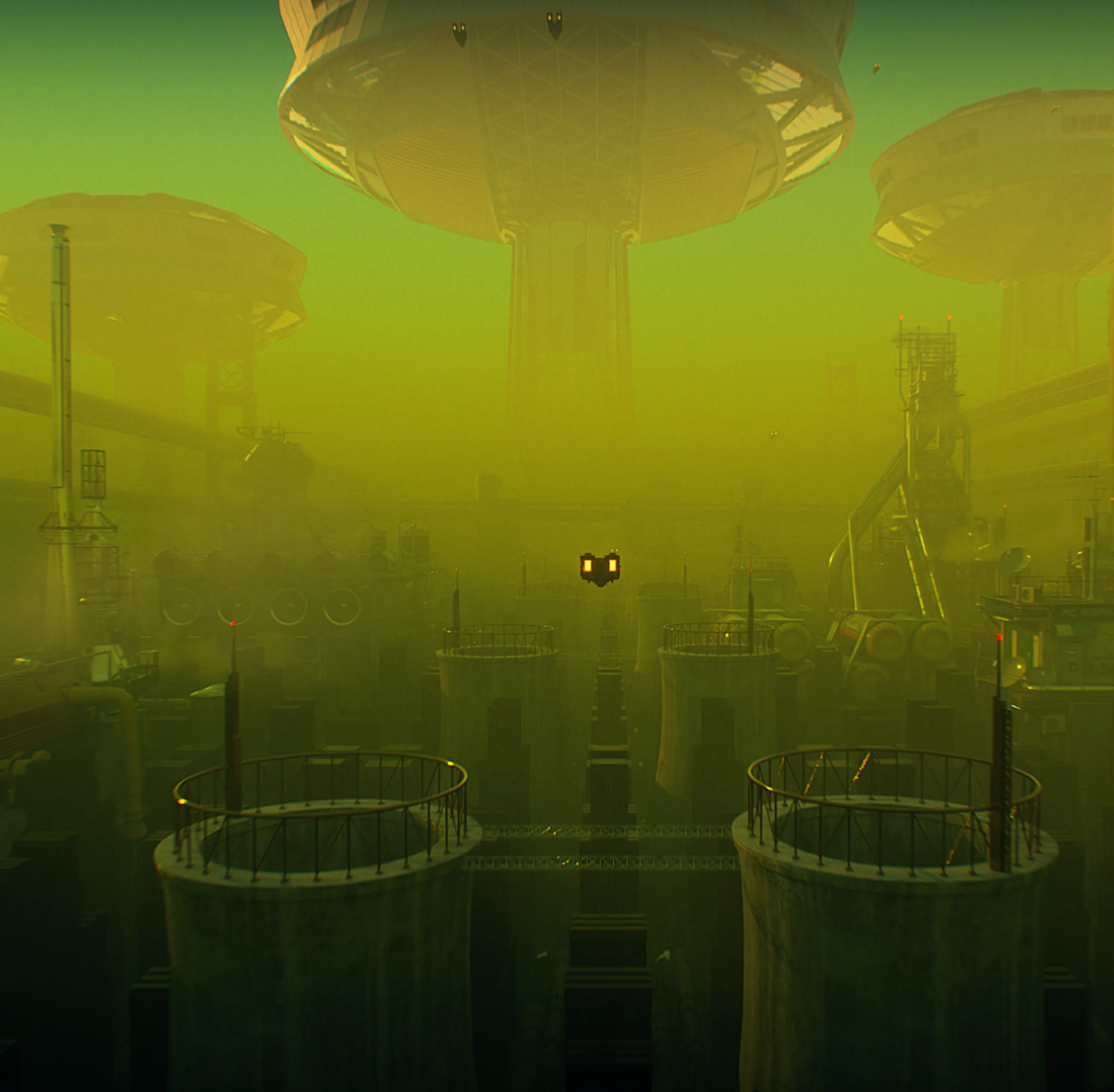 Starting from a neutral clay render emphasizing form and repetition, the final version introduces a toxic color palette, layered haze, and practical light sources. The goal was to evolve a purely structural environment into a narrative-driven space that feels hostile, polluted, and alive.