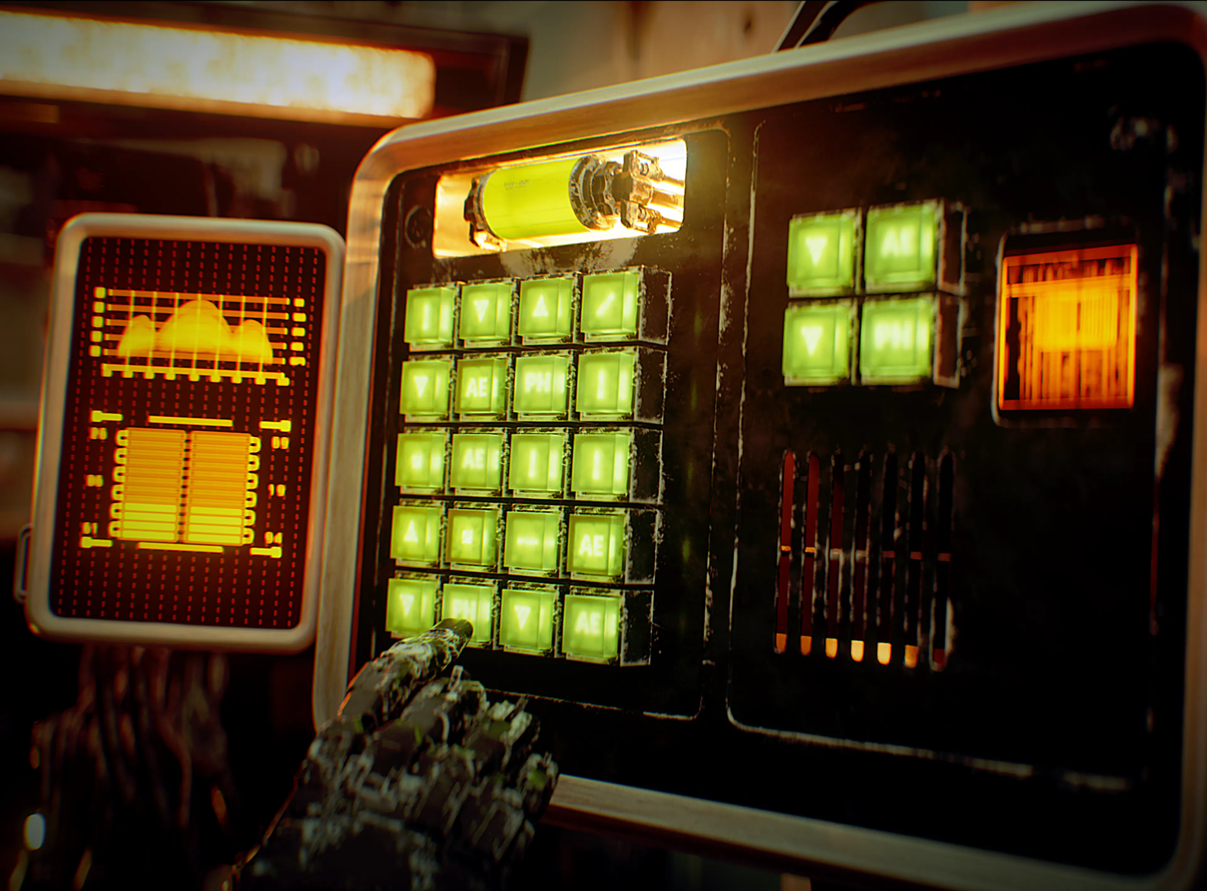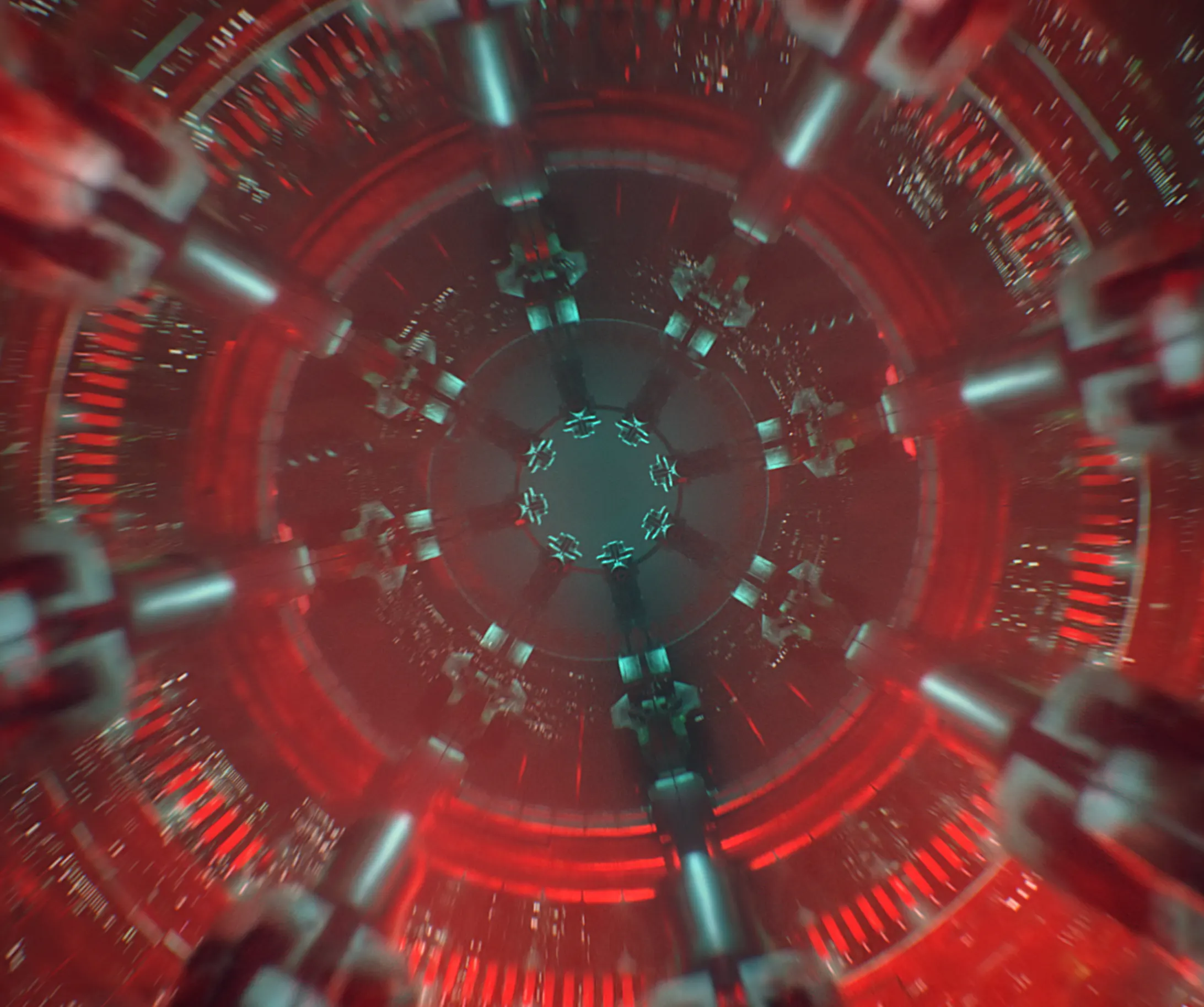 Low-key, cinematic lighting with strong volumetric fog, bloom, and light scattering. Practical light sources (monitors, warning panels, reactors) drive scene illumination, creating high contrast and depth while grounding the scenes in realism.