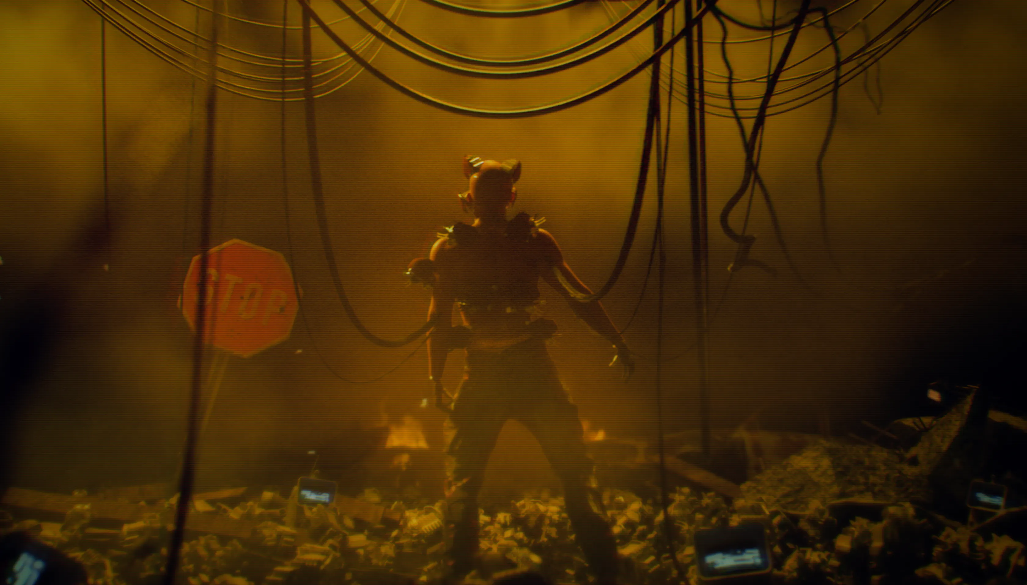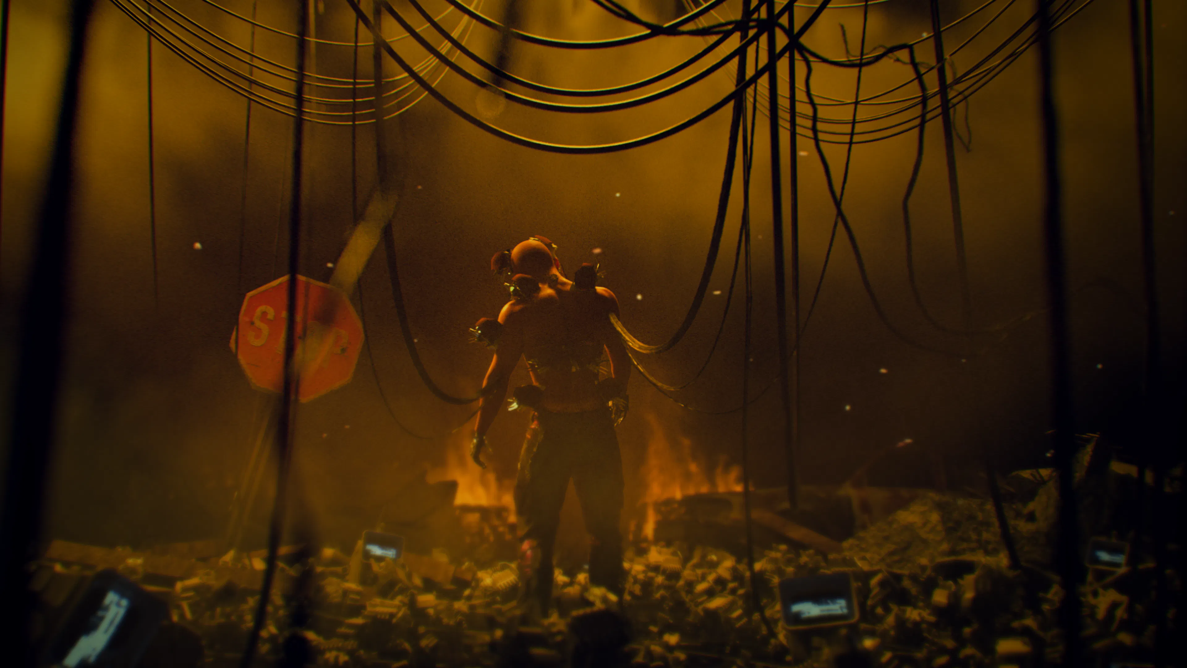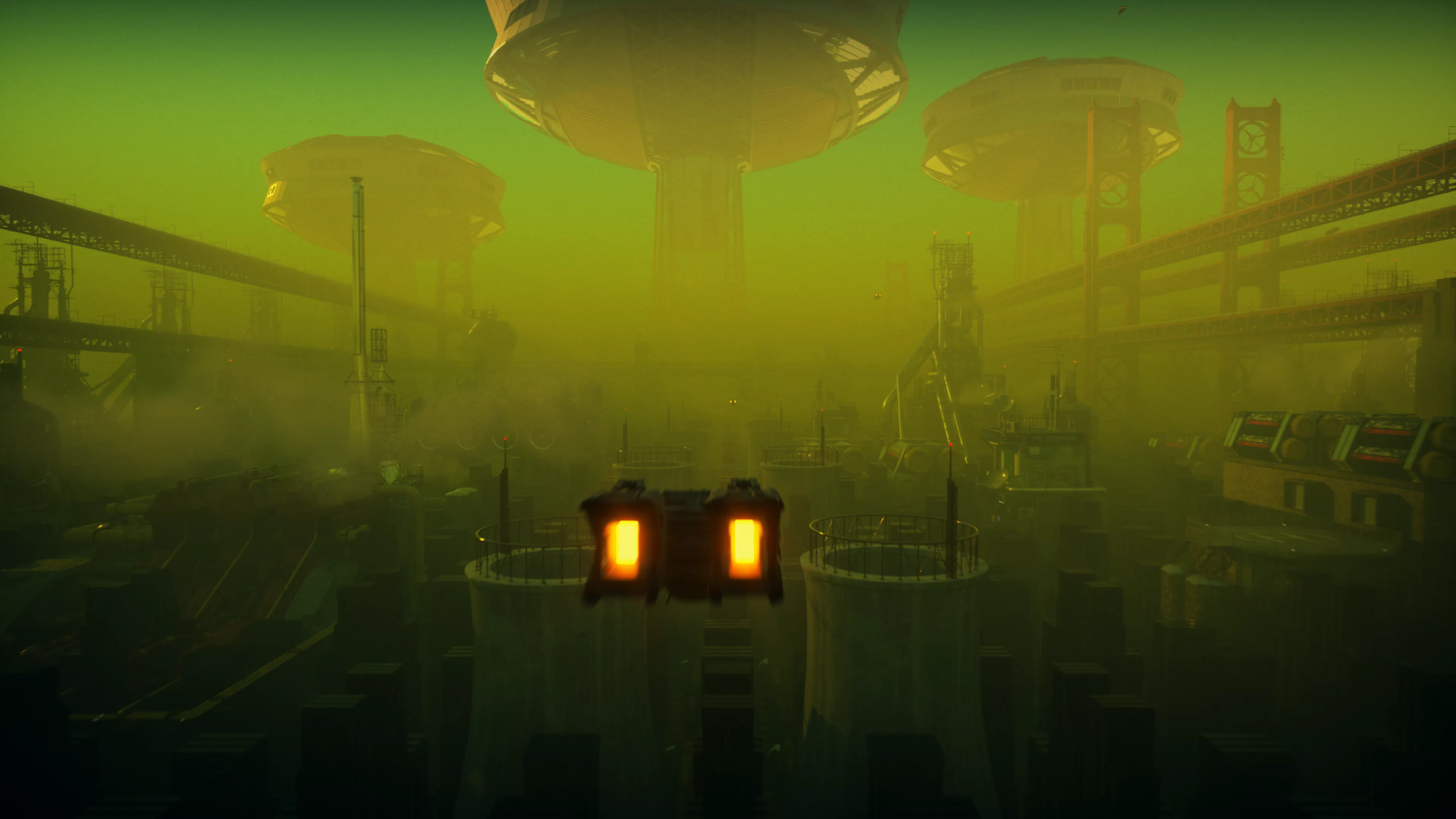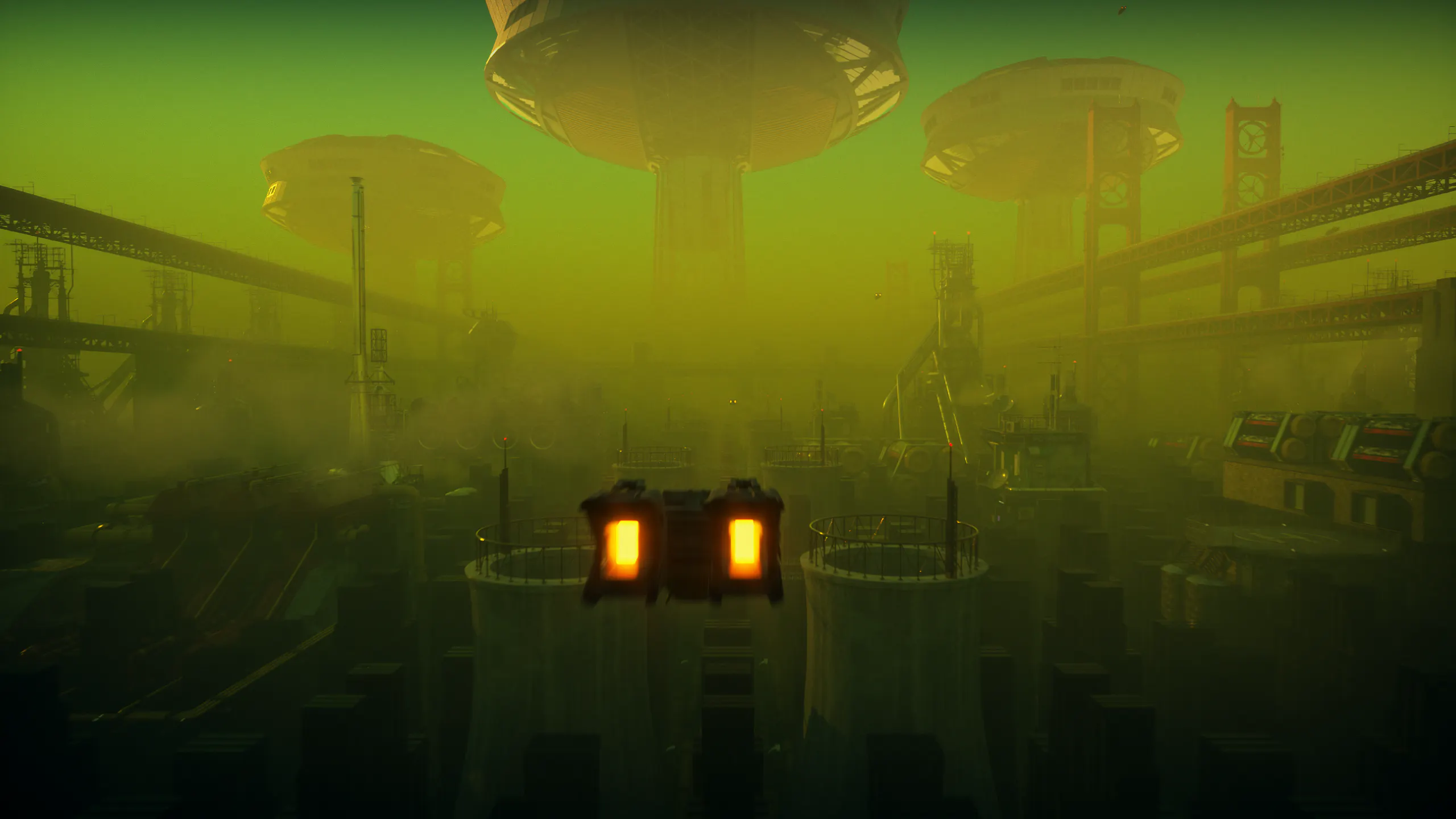 Thick haze, particulate matter, and environmental noise give the scenes weight and scale. The air feels contaminated, dense, heavy, and alive, supporting themes of industrial overreach and biological experimentation.