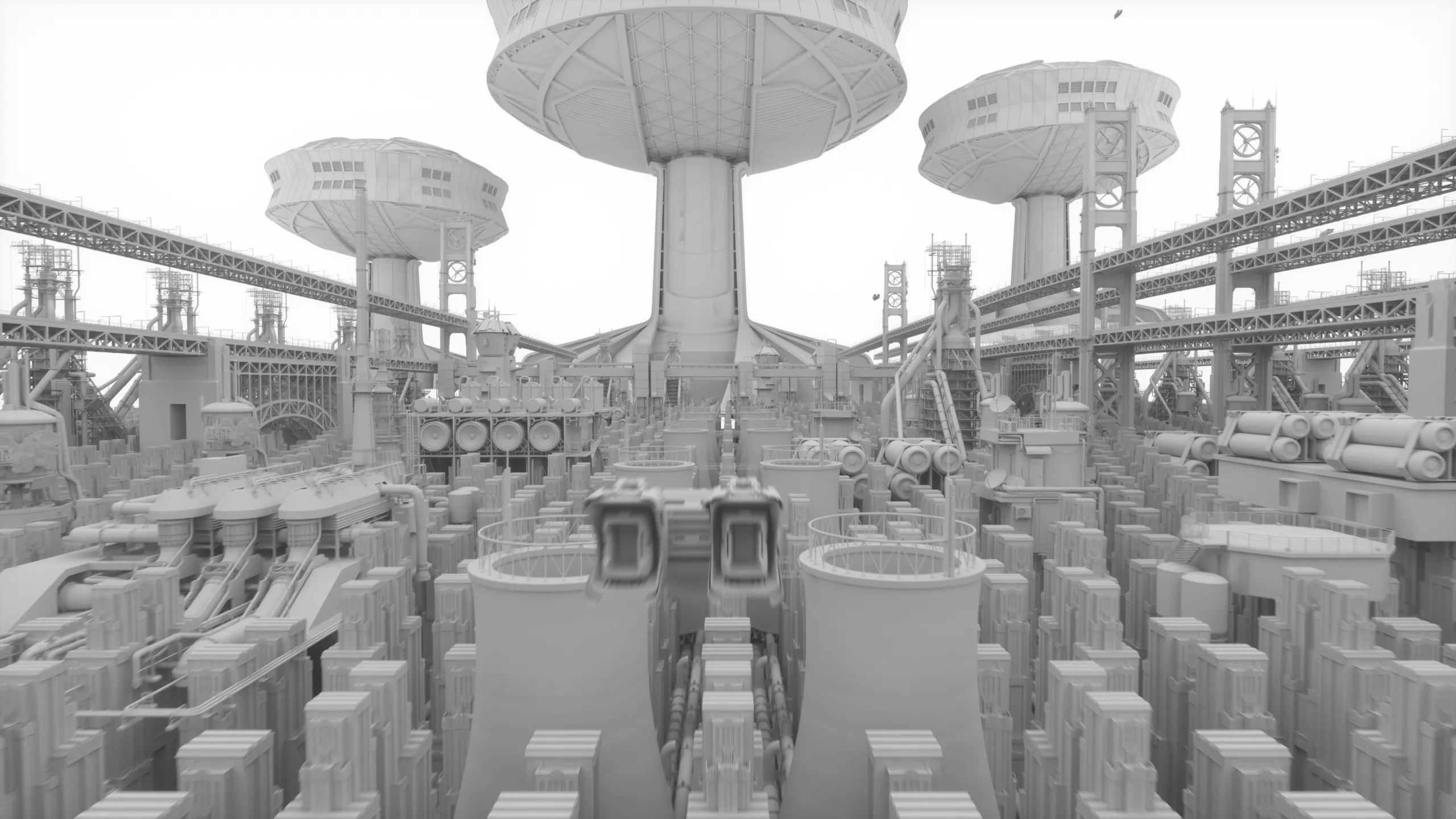 This piece showcases the transition from a clean, unlit blockout to a fully realized cinematic environment. The initial stage focuses on composition, scale, and architectural density, while the final render introduces volumetric fog, color grading, and atmospheric lighting to transform the scene into a dense, industrial sci-fi landscape.