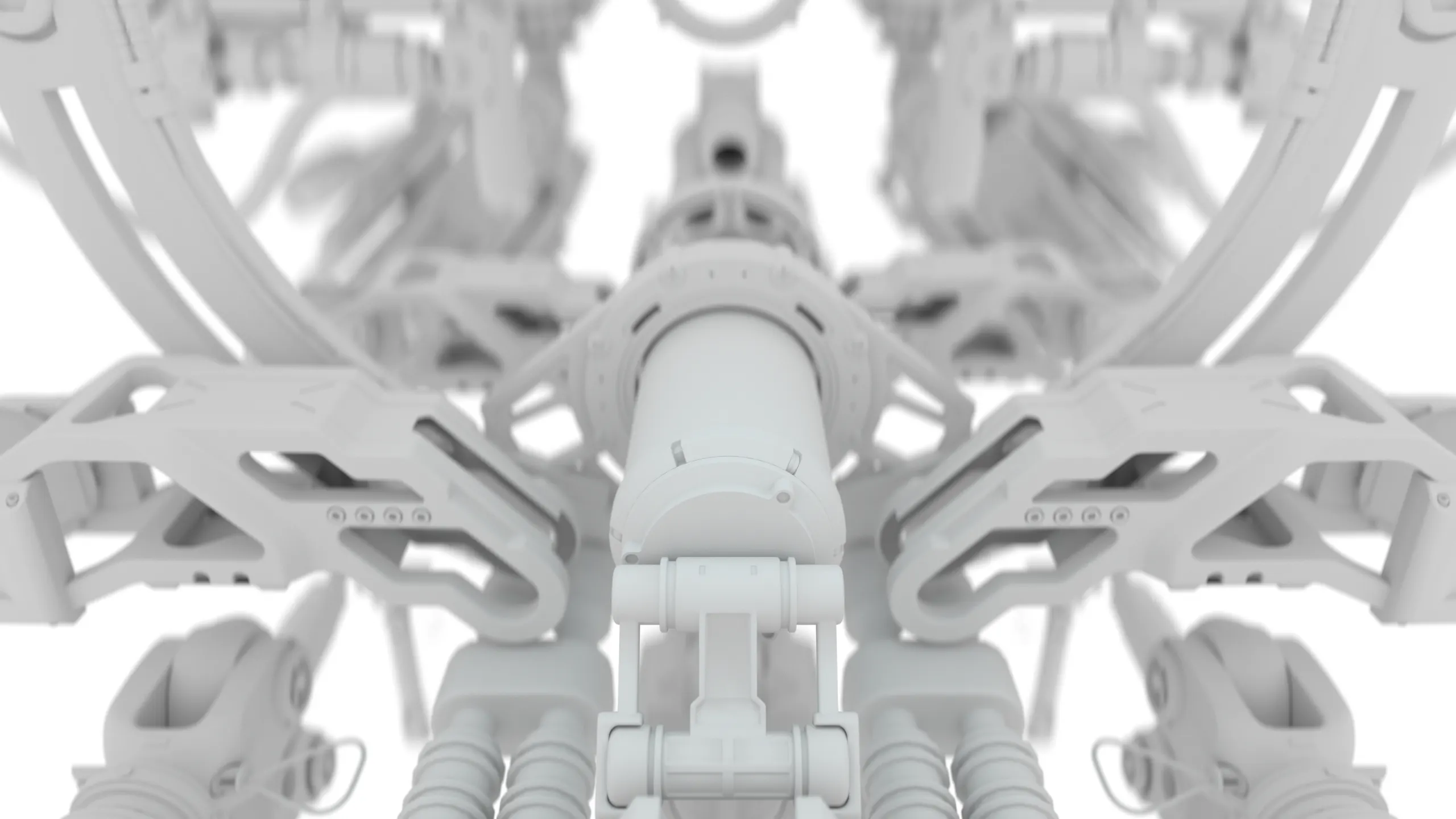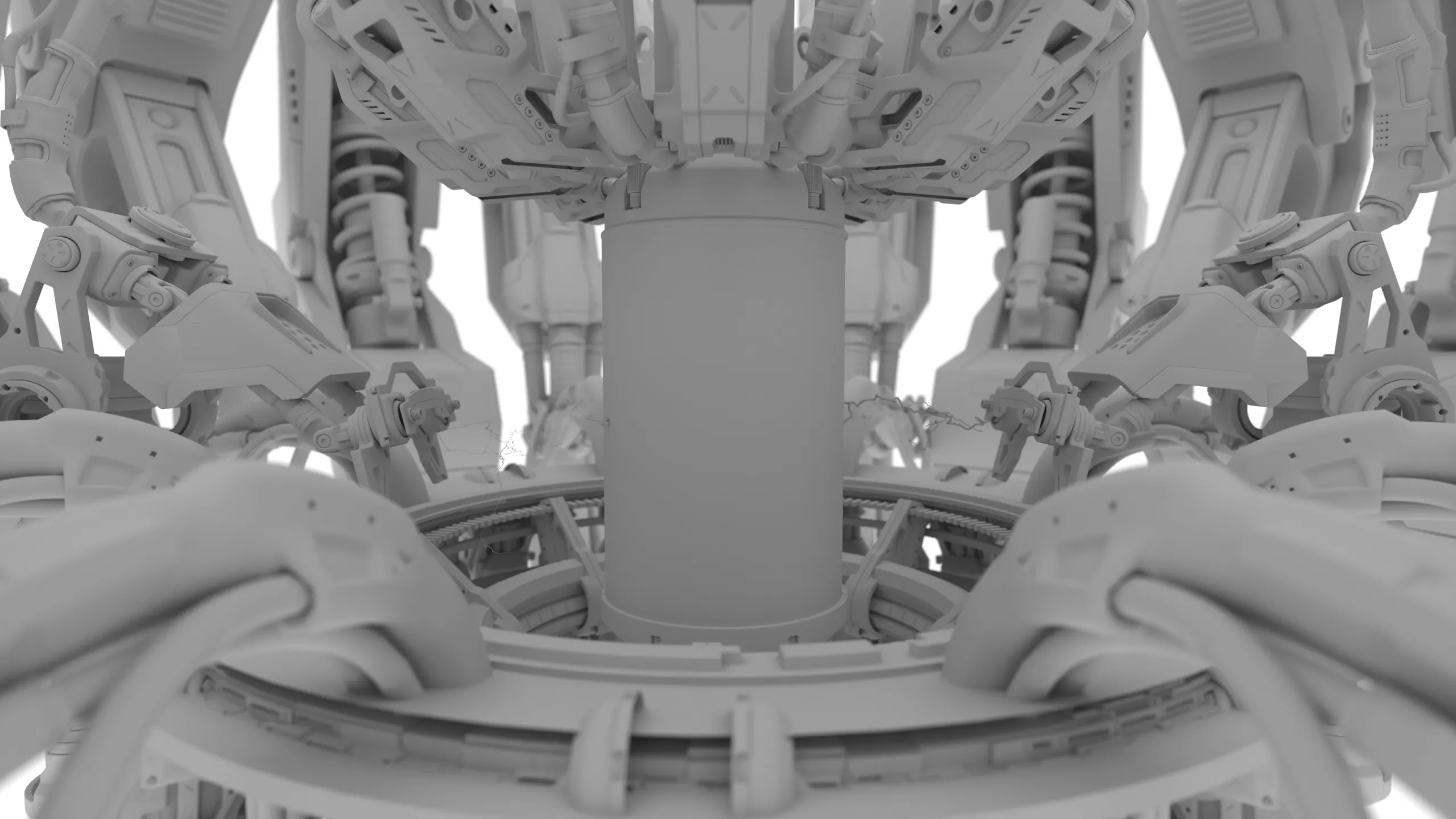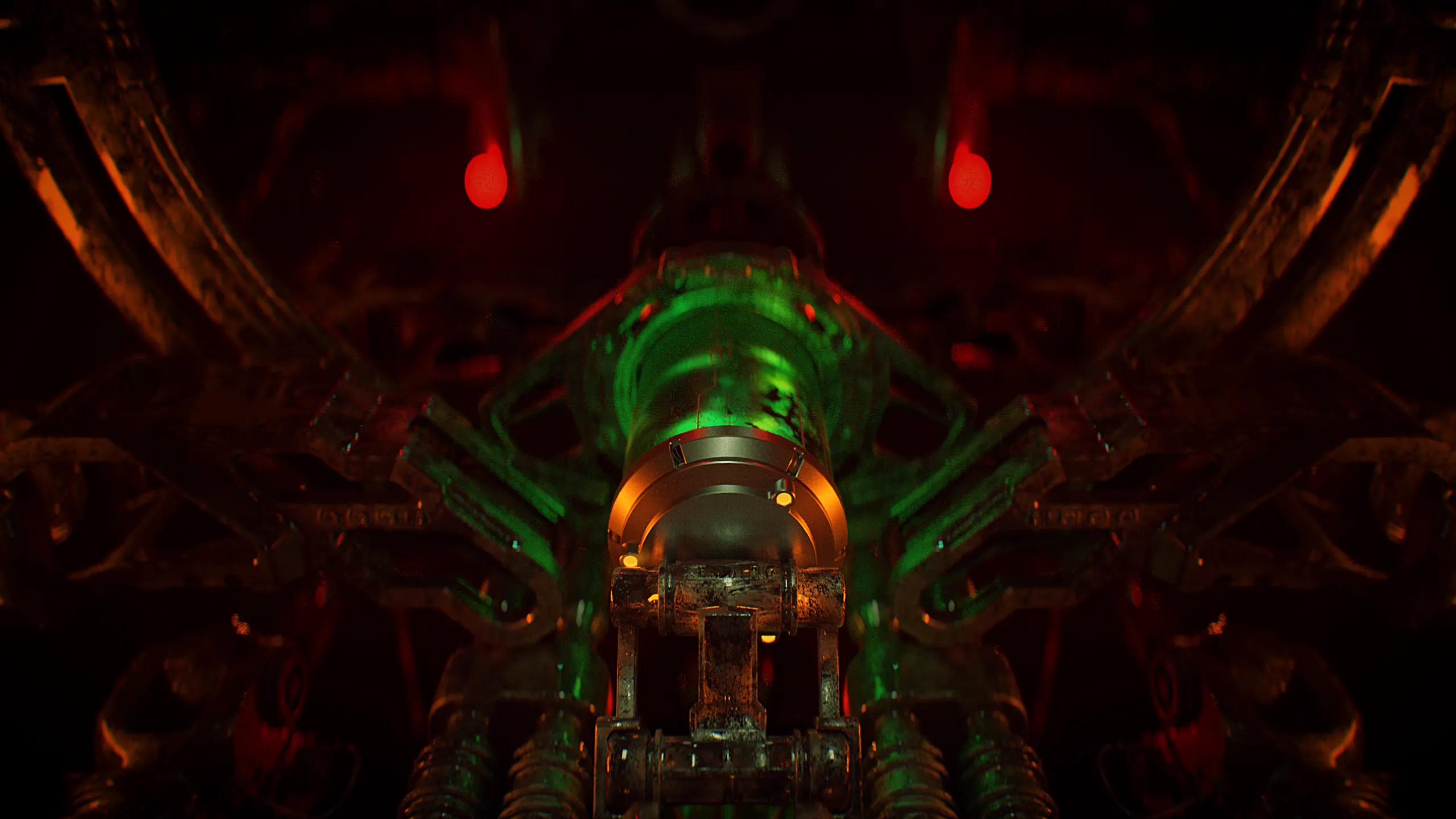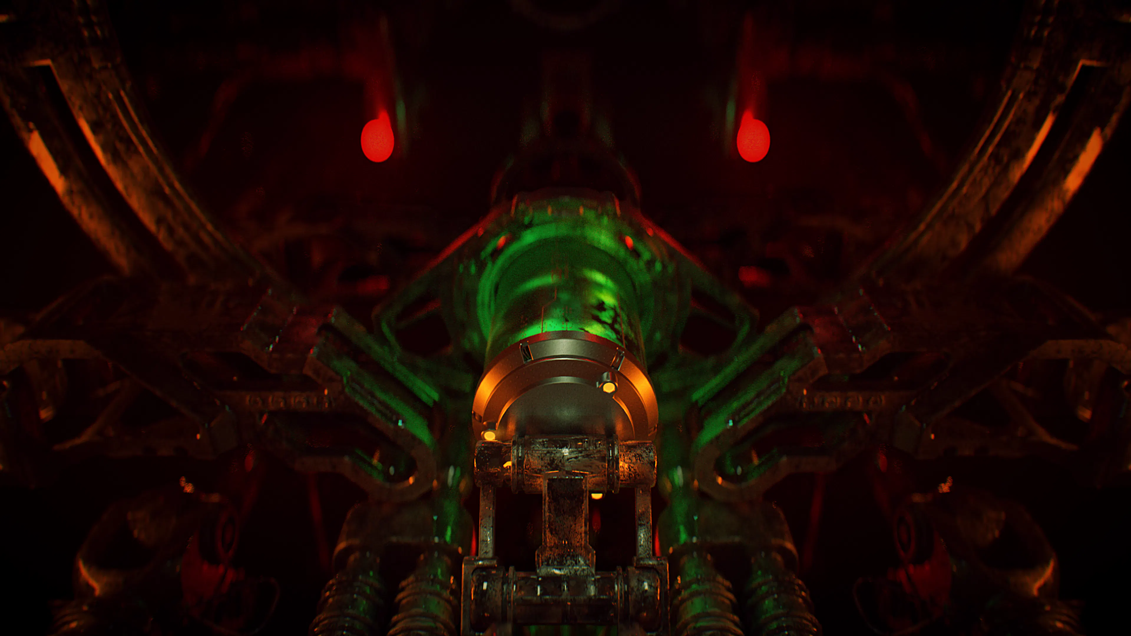 The before state isolates mechanical design, symmetry, and engineering logic. In the final render, materials, emissive elements, and contrast-driven lighting bring the machinery to life, shifting the focus from technical construction to mood, tension, and visual storytelling.